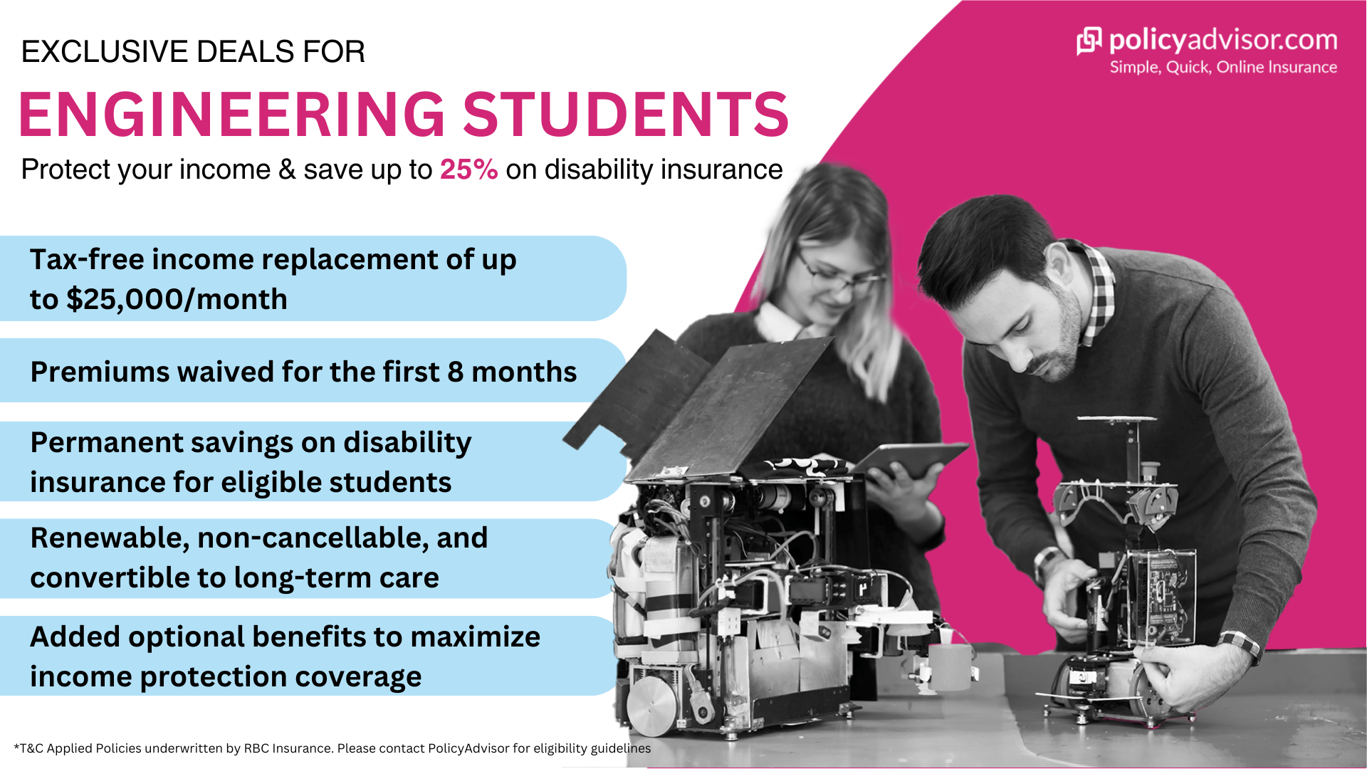 The offer available through PolicyAdvisor is the Engineering Student Offer with 25% savings on disability insurance.