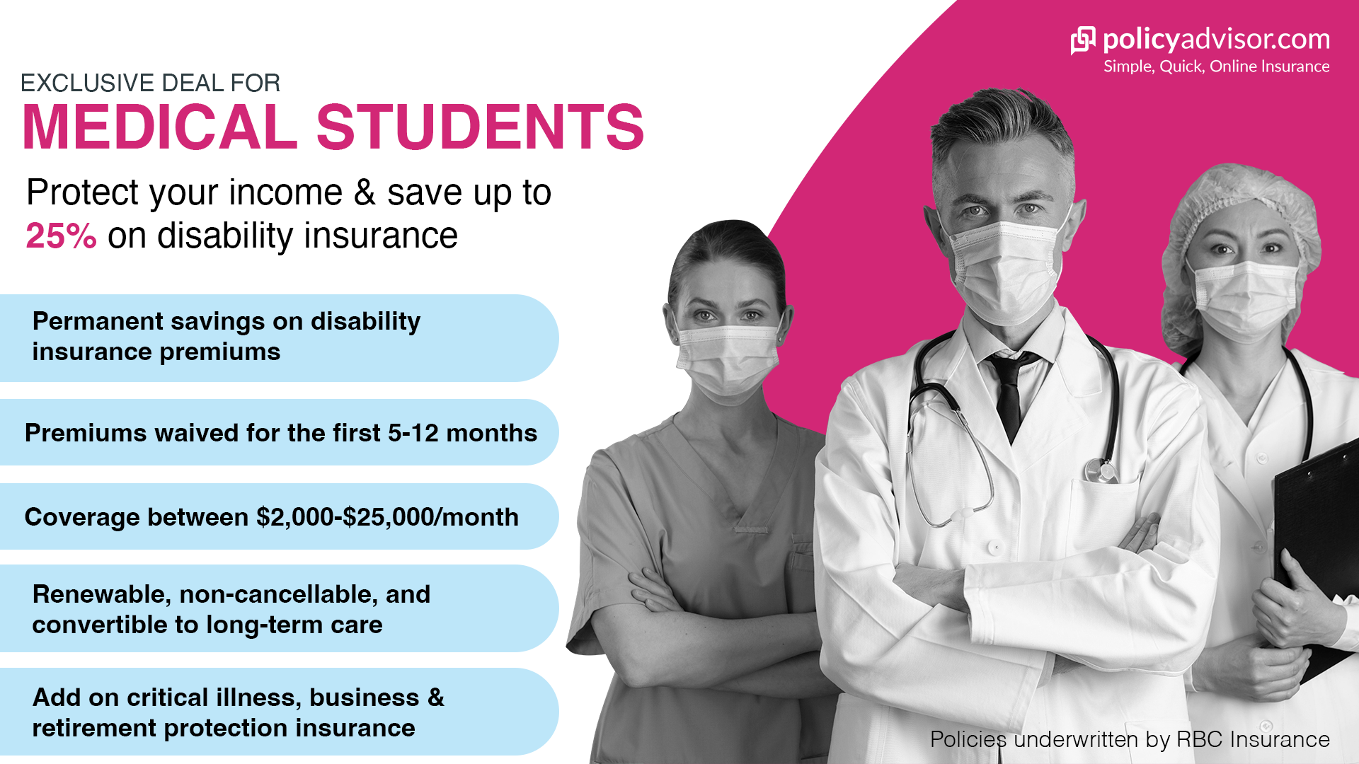 The offer available through PolicyAdvisor is the Medical Student Offer with 25% savings on disability insurance.