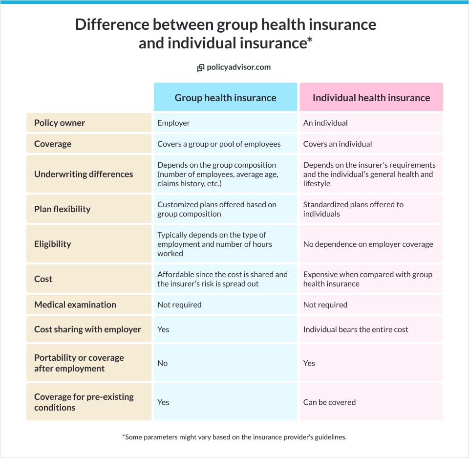 The main difference between a group health plan and an individual health plan is reflected in their respective names—the former covers a “group” of employees in an organization while the latter is purchased by an individual for personal health coverage.