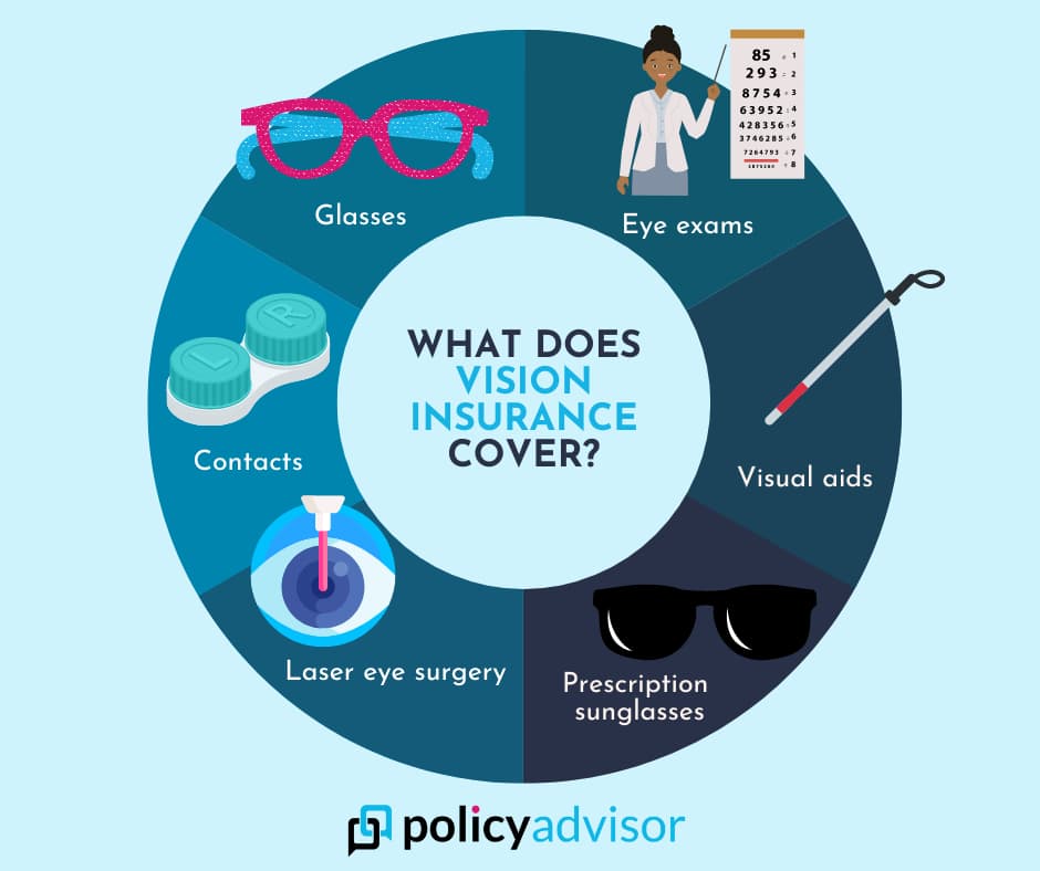 Most health insurance policies include coverage for vision and eye care. Coverage usually includes eye exams, glasses, contacts, prescription sunglasses, and more. It’s uncommon to find a stand-alone vision care insurance policy—most have at least basic health care included in their packages in combination with comprehensive vision care.