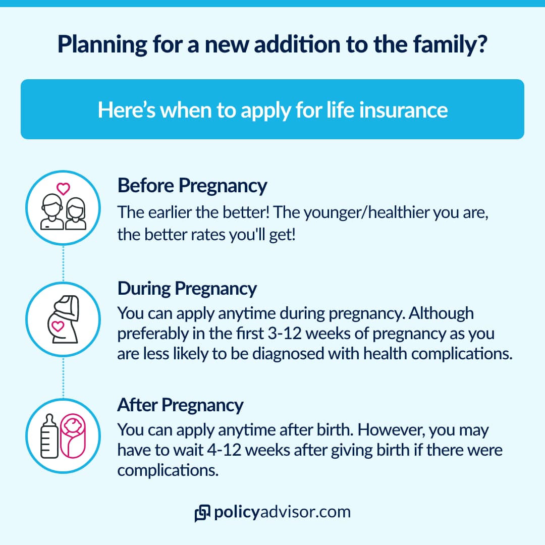 The earlier the better! The best option is to apply for life insurance before you get pregnant. If you’re already pregnant, you should apply for life insurance in the first trimester of pregnancy.