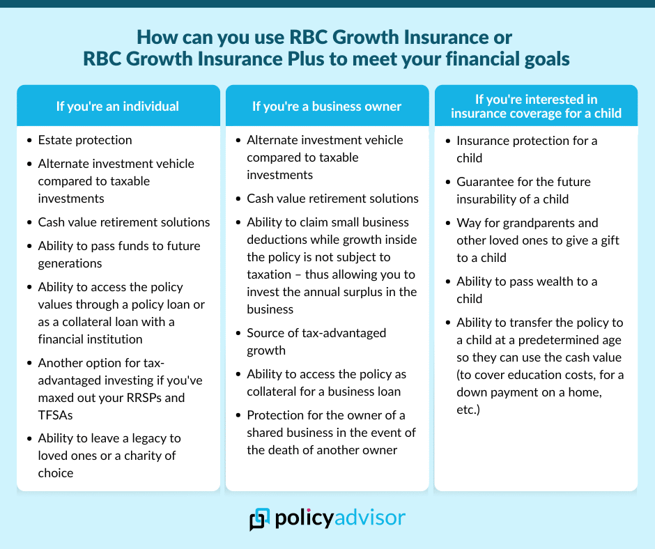 - RBC Growth Insurance Plus: Offers lifelong coverage starting at $250,000, with cash value accessible after the first year. It includes the same dividend options as the Growth Insurance plan.
