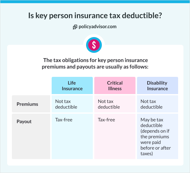 It depends on the type of key person insurance and whether you’re looking at premiums or payouts. Generally, premiums are not tax-deductible but payouts are tax-free.