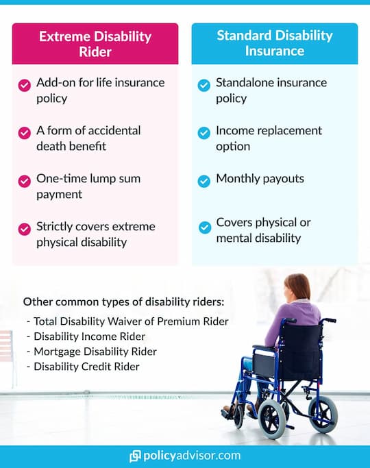 This rider isn’t to be confused with disability insurance or critical illness insurance, although all of these typesof coverage can help in the event of loss of income due to illness or injury. The extreme disability benefit rider provides partial benefits in the form of a lump-sum advance on your life insurance payout.
